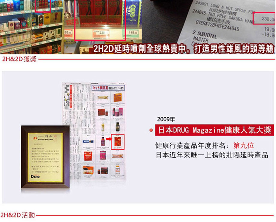 作為日本丸榮集團推出的全球首個天然外用延時產品。2H2D延時噴劑於2008年在日本上市,該品甫壹露面便震驚業界:全部采用天然草本原料,全球唯壹通過提取中藥成分,實現超長延時的外用產品。首創三角循環機理,效果相乘而非相加,最高可延時可達30分鐘以上,堪稱外用早洩產品中的“終結者”,2H2D延時噴劑已連續三年蟬聯日本延時產品銷售冠軍。